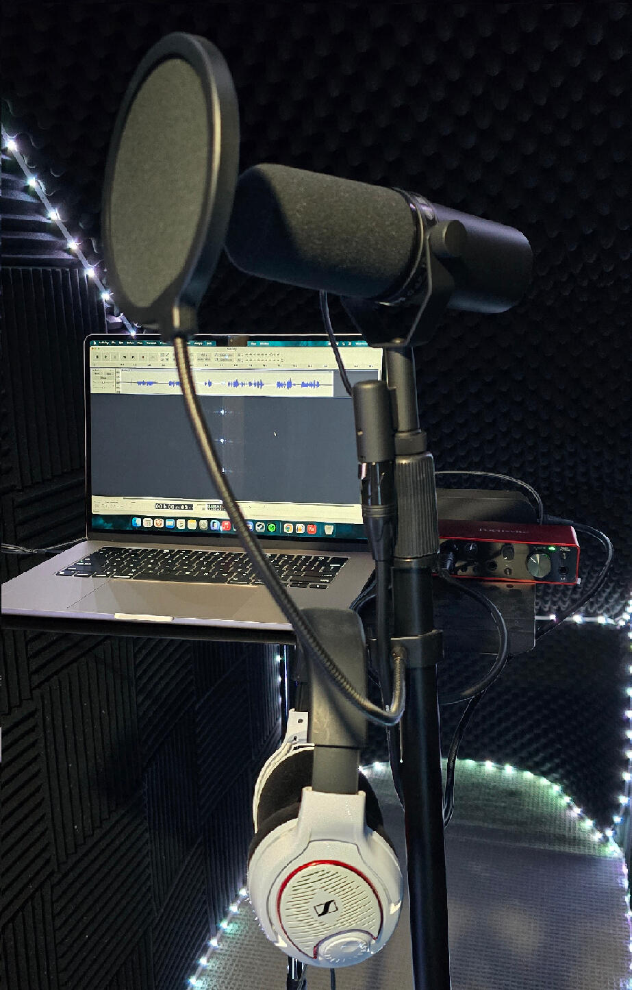 This is my professional-grade home studio where I do all of my recording!I use a Shure SM7B microphone with a pop filter and Audacity as my editing software. My home studio is equipped with sound-proofing and I offer directed sessions through audio/video conferencing.